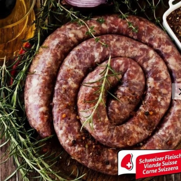 Meat contents: 65% Beef (CH),35% Pork (CH), Salt, Pepper, Coriander, NutMeg, cloves.